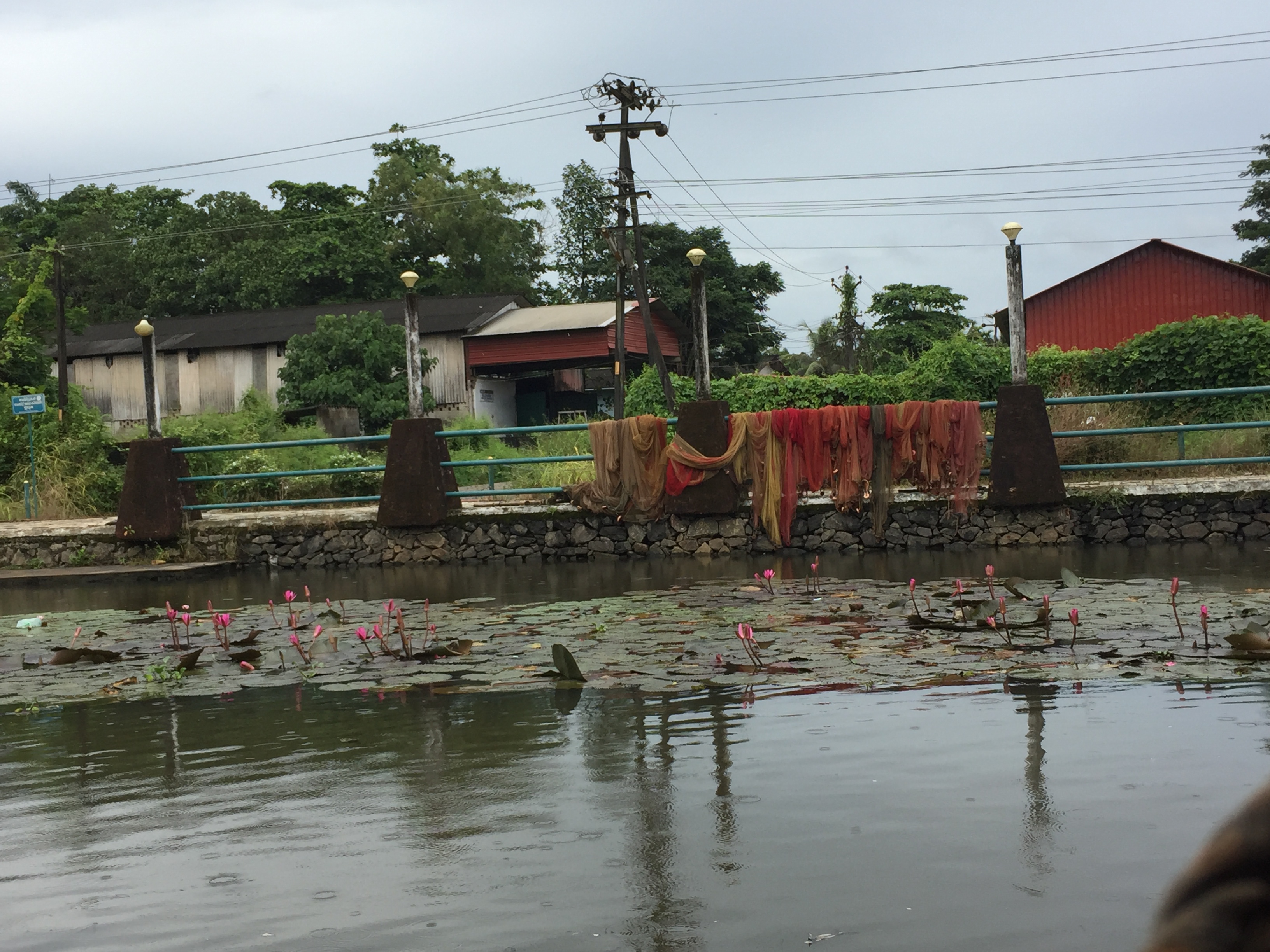 Voici les backwaters Back waters.Avec des oiseaux The birds.Les barques. Boats.A good friend in the boat. Une belle amie dans le bateau.Il sèche ces ailes au soleil He dry his wings in the sun.Les filets de pêche.Fish filets.The sky is blue. Ciel bleu.