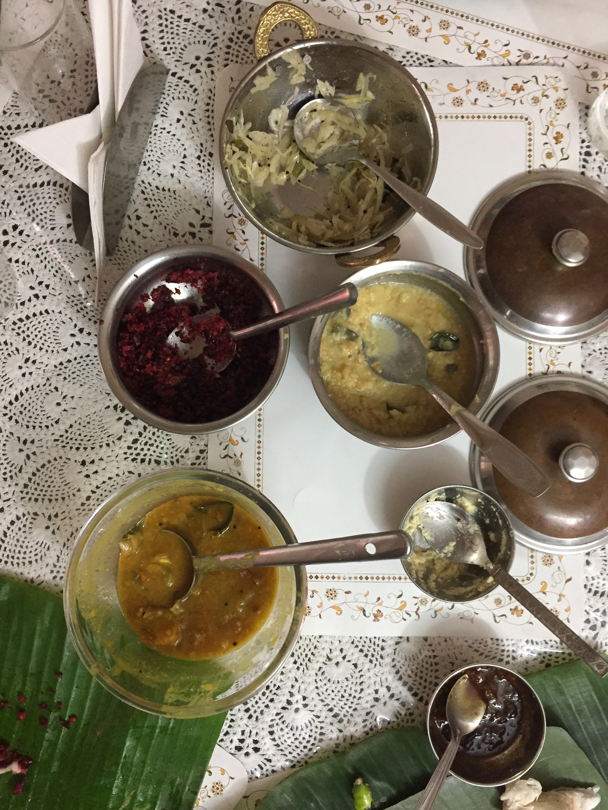 Tout est servi sur une feuille de bananier et bien sûr on mange avec les mains. Ça change complètement le contact avec la nourriture et aussi le goût. On peut même roter à table, ça viendra……, on a besoin de temps pour s’y habituer.